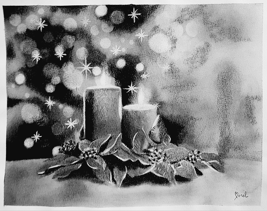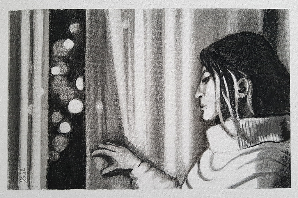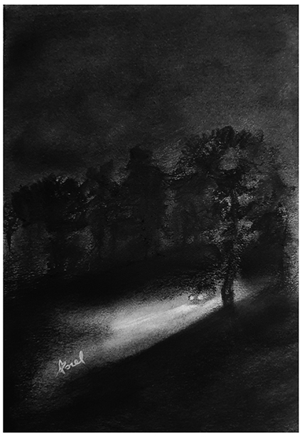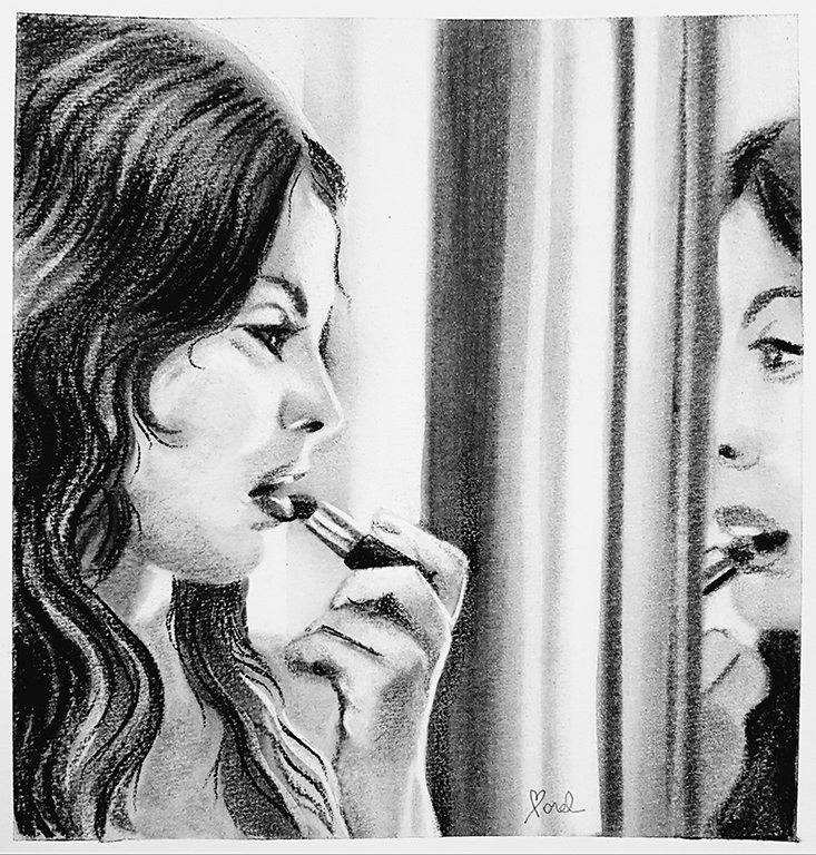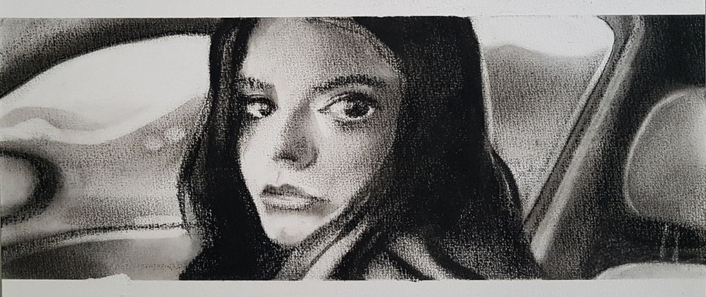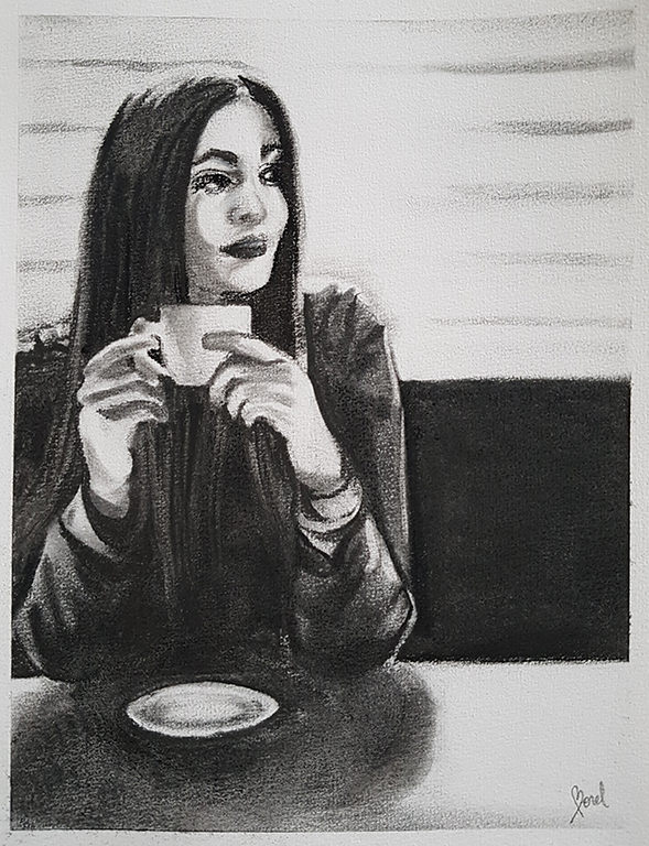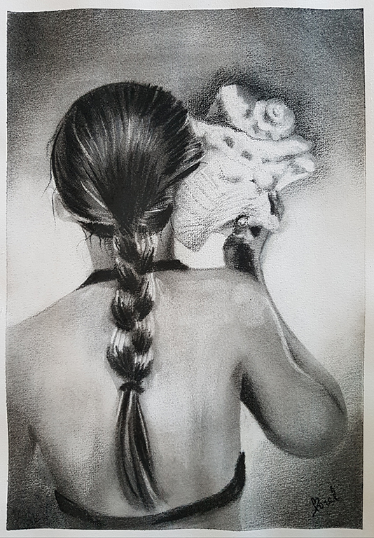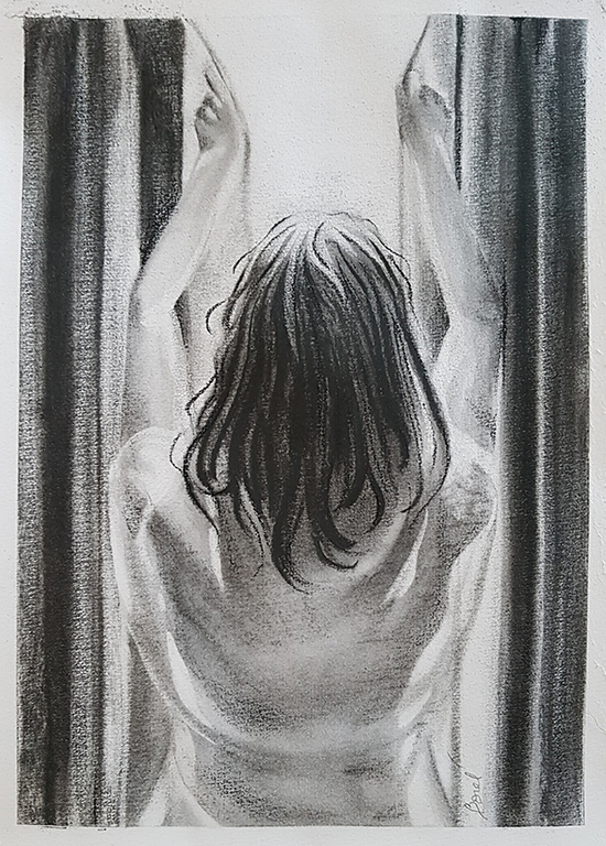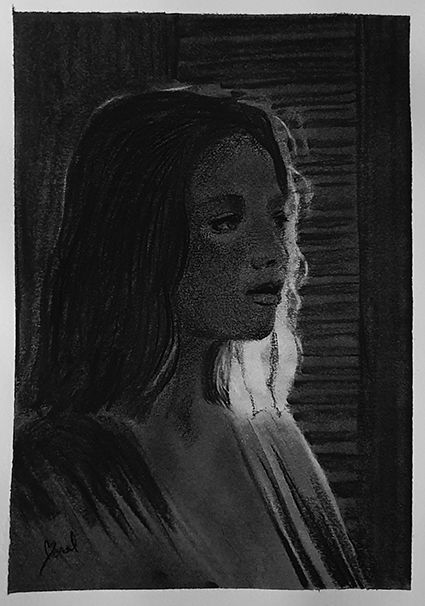 Ces dessins sont réalisés au fusain, une autre technique en noir et blanc que j’affectionne.
